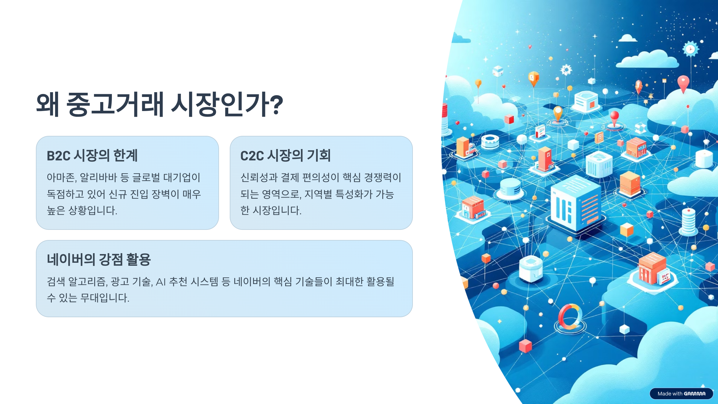 - 포화된 B2C와 대비되는 기회: 아마존·알리바바 같은 강자들이 지키는 B2C 대신, 신뢰와 결제가 핵심인 C2C에서 승부를 보려 합니다.