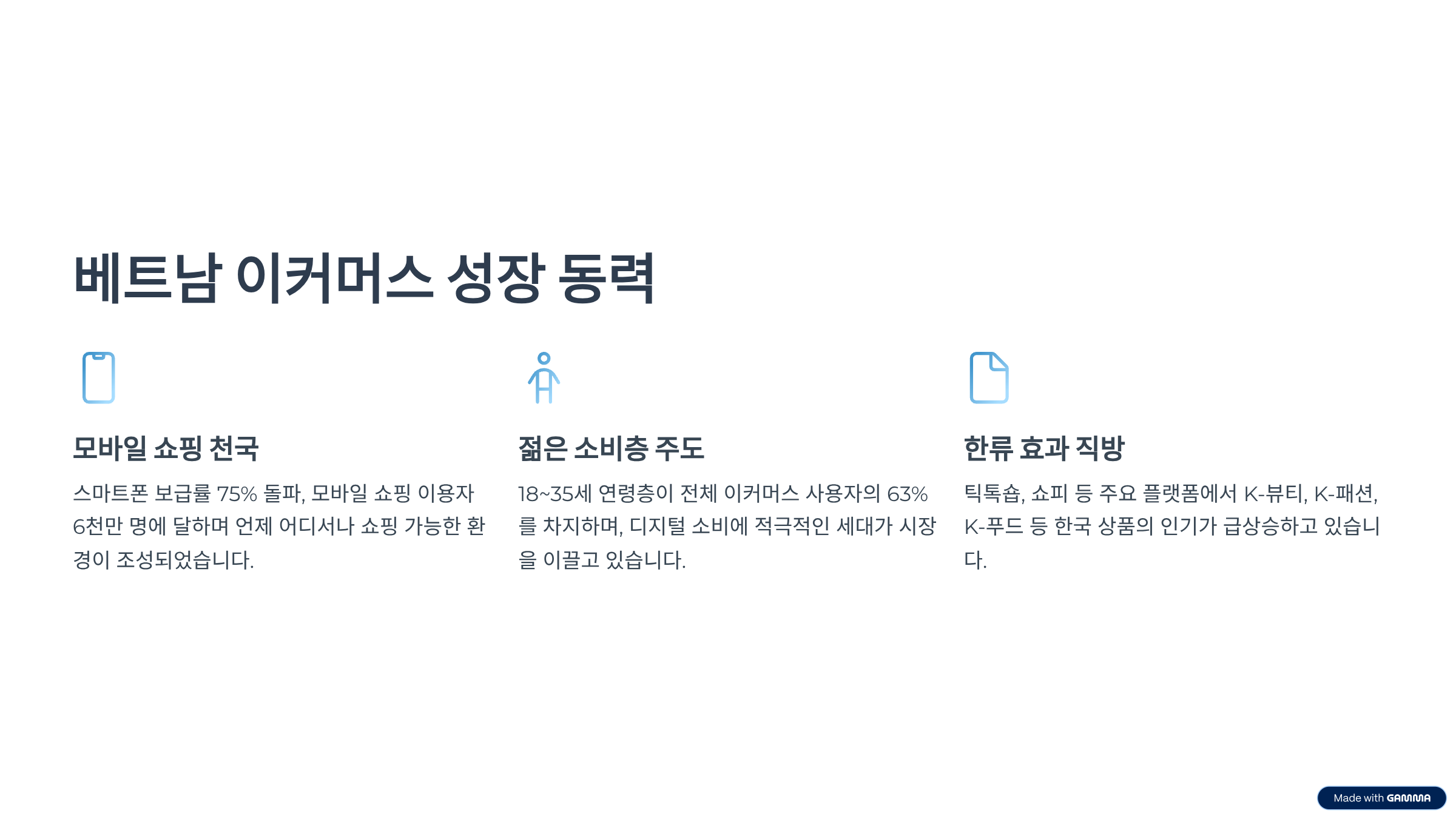 요약: 모바일 중심의 젊은 소비층과 플랫폼 지원이 결합되어, 베트남 이커머스는 빠르게 성장 중입니다.